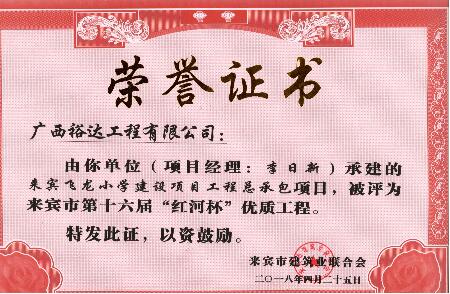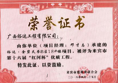 近期,从来宾市建筑业联合会传来喜讯,九游·体育(jiuyou.com)官方网站承建的“来宾城南幼儿园建设项目”“来宾市城南初级中学建设项目”“来宾飞龙小学建设项目工程总承包”“裕达·金碧天誉B区17#楼”和“裕达·金碧天誉B区18#楼”共5项工程项目被评为来宾市第十六届“红河杯”优质工程,这是继2011年至2017年荣获的25项“红河杯”优质工程之后,再获此荣誉。