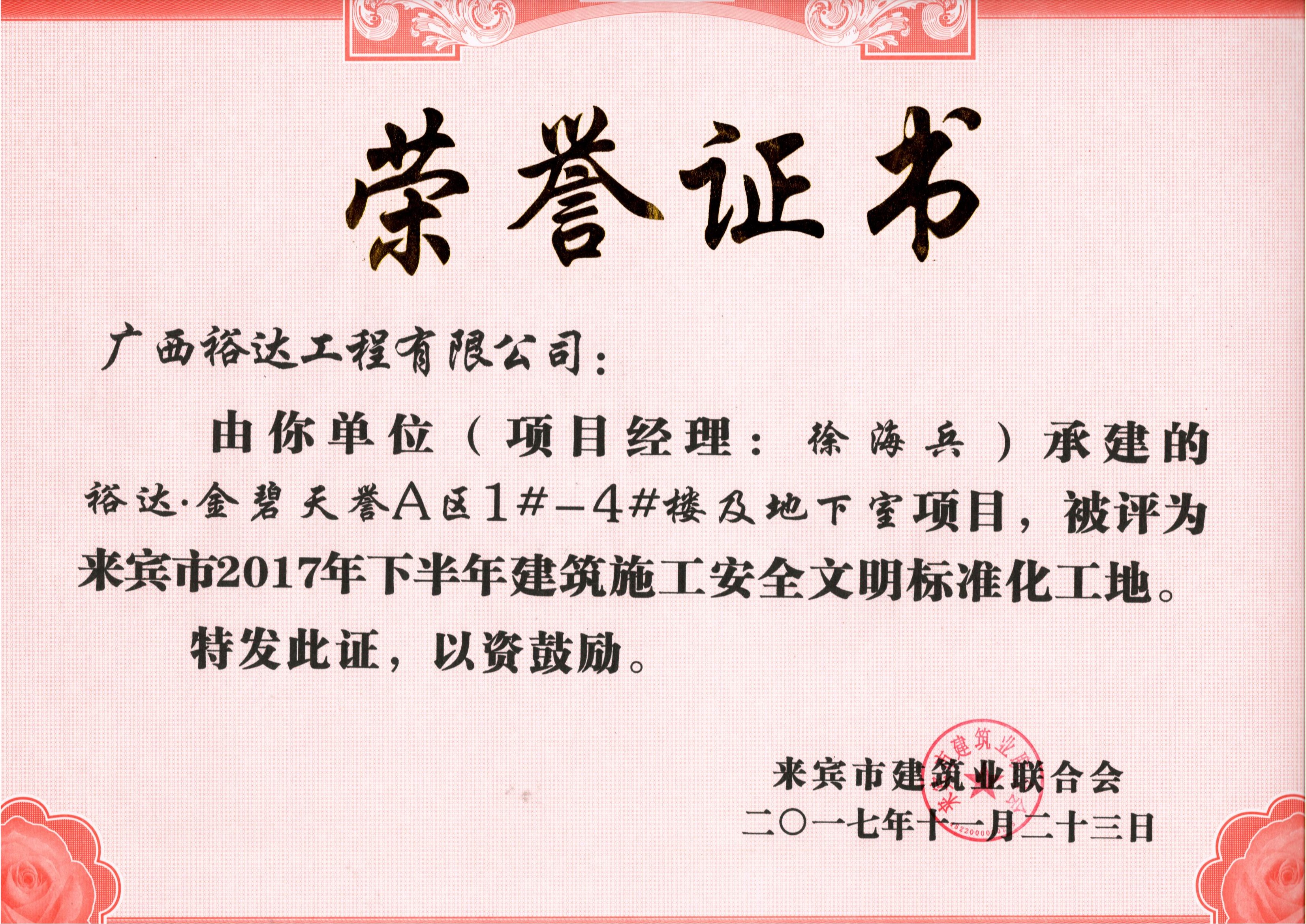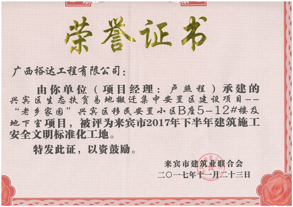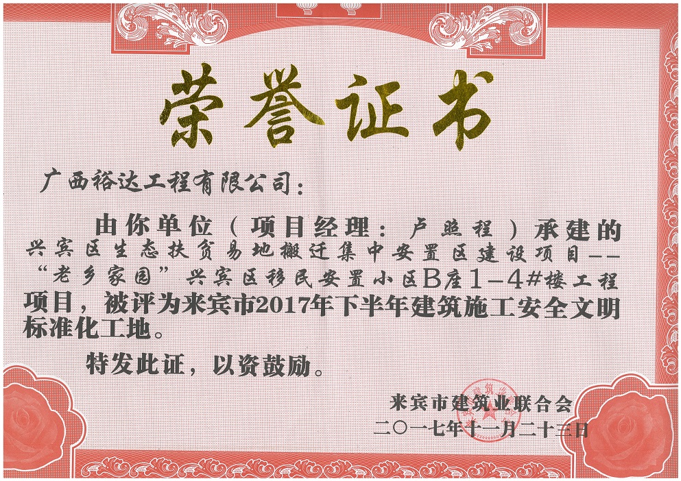 近日,由九游·体育(jiuyou.com)官方网站承建的兴宾区生态扶贫易地搬迁集中安置区建设项目—“老乡家园”兴宾区移民安置小区B座1-4#楼、B座5-12#楼及地下室、裕达·金碧天誉A区1#-4#楼及地下室,共3个工地荣获来宾市2017年下半年“安全文明标准化工地”荣誉称号。