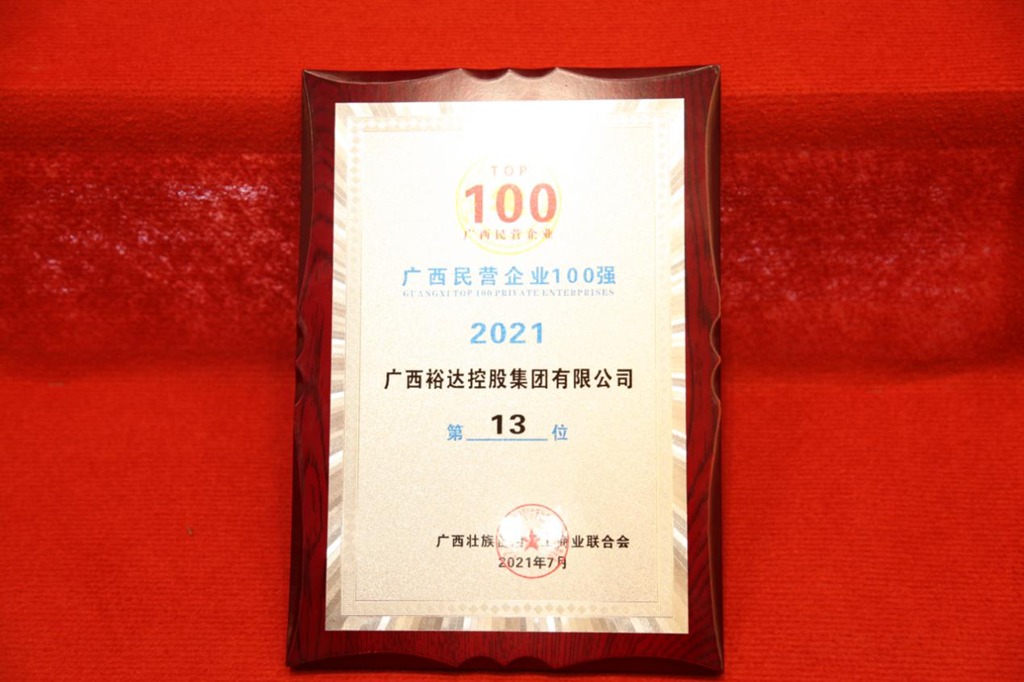 喜报:广西裕达控股集团荣获2021年广西民营企业100强第13强!