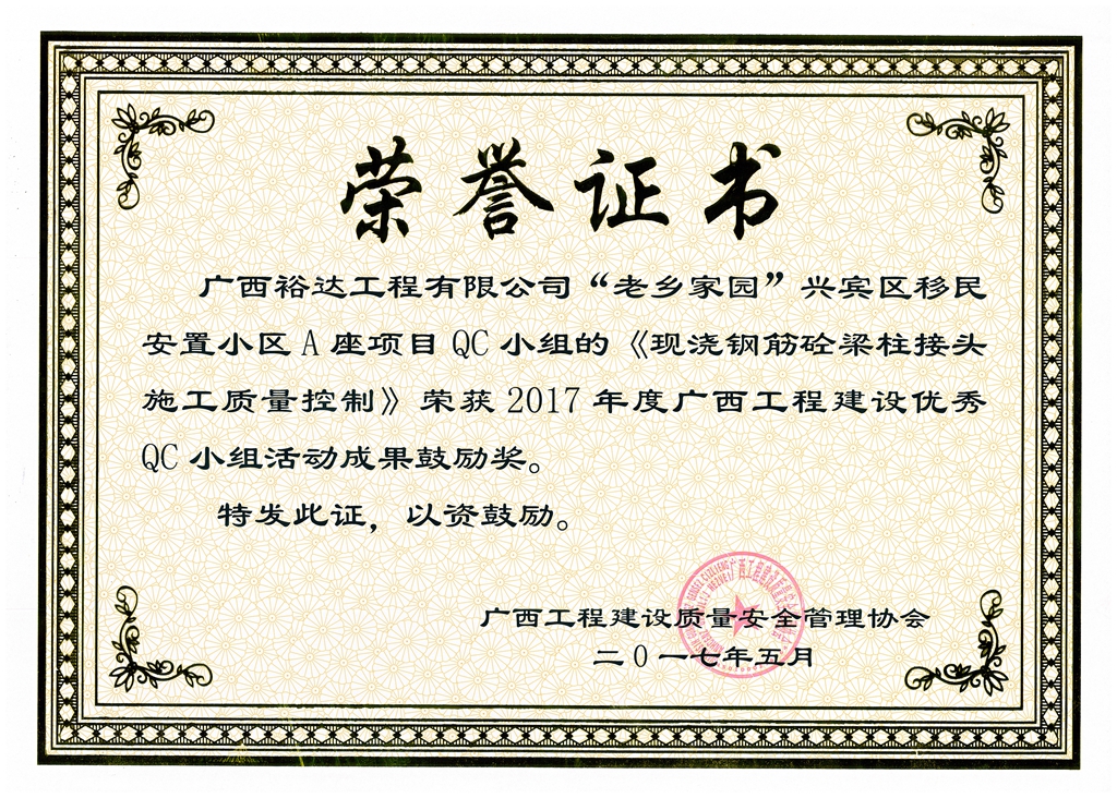 2017年广西工程建设优秀QC小组活动成果鼓励奖