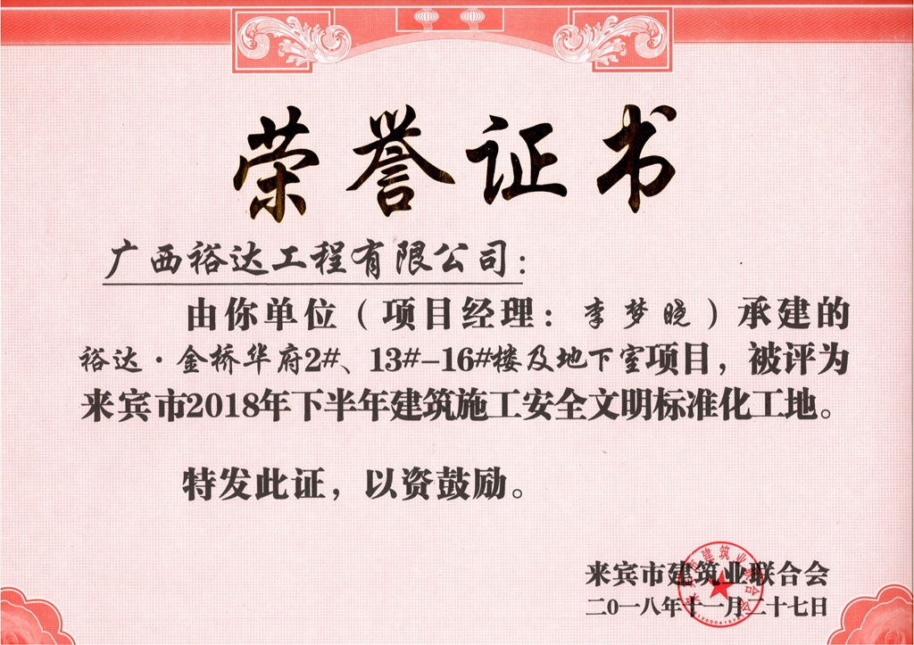 来宾市2018年下半年安全文明标准化工地(裕达。金桥华府2#、13#-16#楼及地下室)
