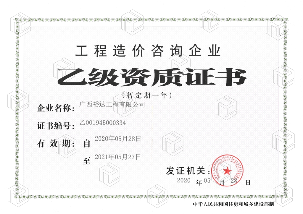 近日,经自治区住房和城乡建设厅的审核批准,公司喜获“工程造价咨询企业乙级资质(暂定一年)”。